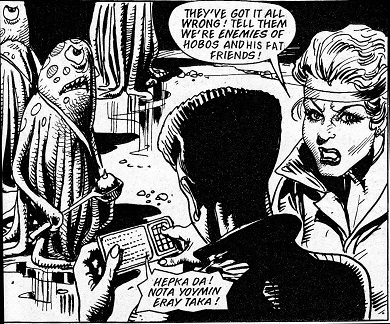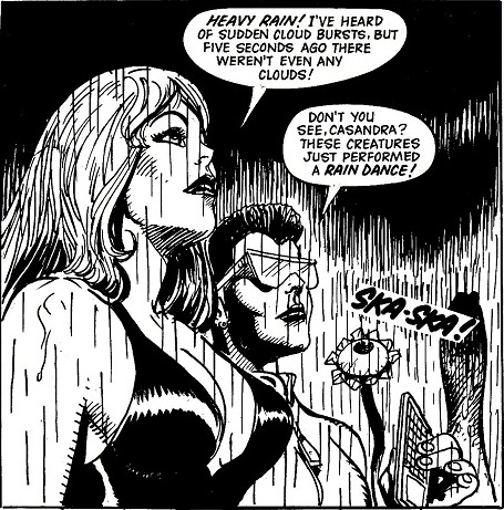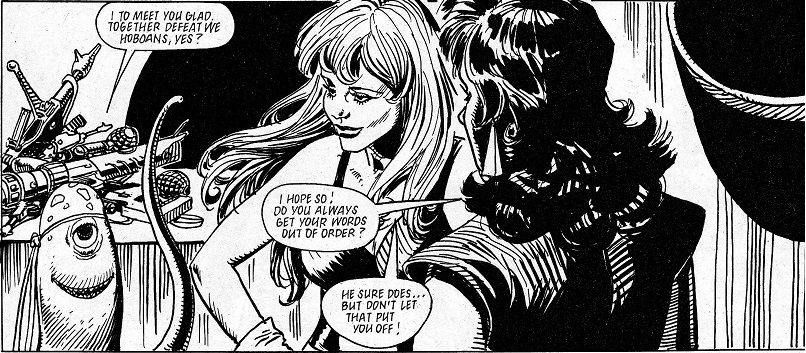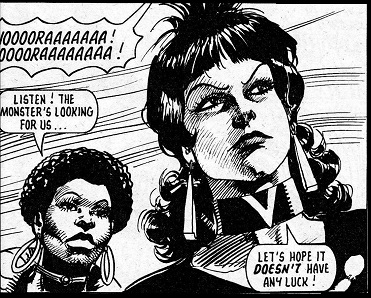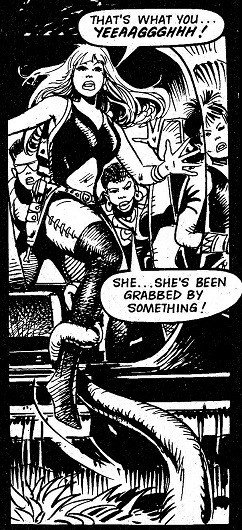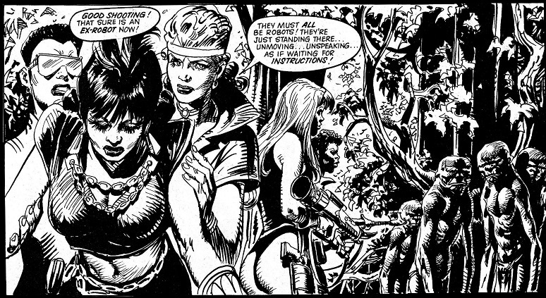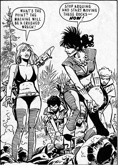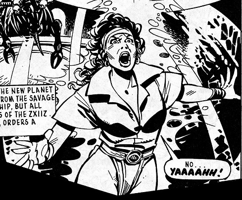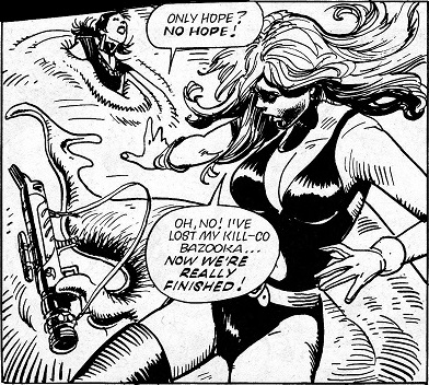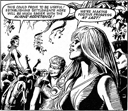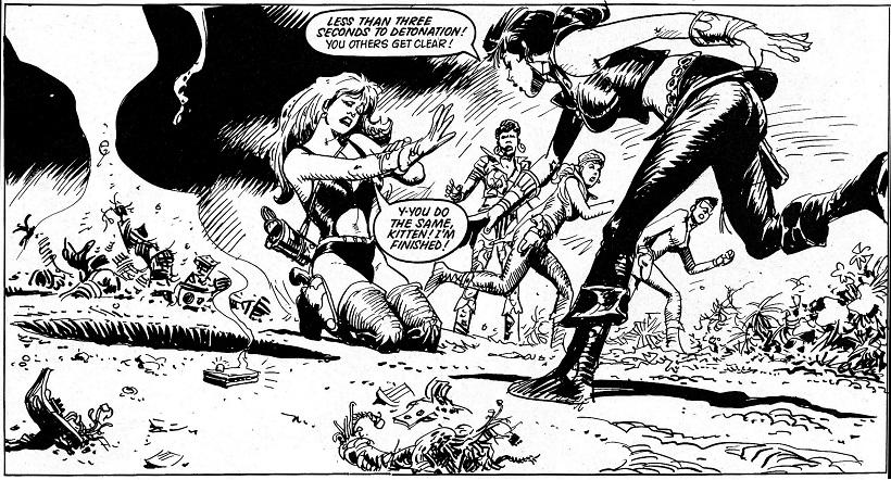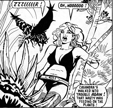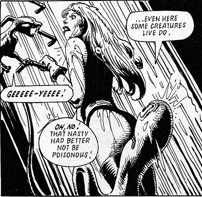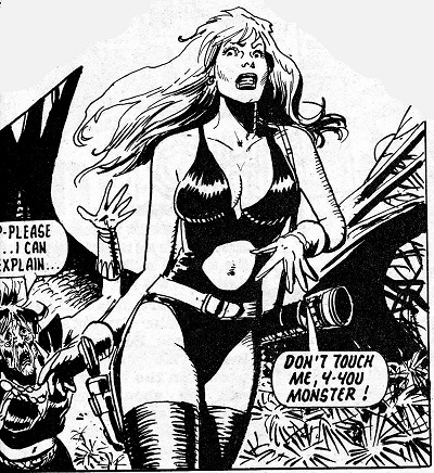 Their adventures involved exploring the tropical jungle area of their new planet and, consequently encountering numerous bizarre and often unfeasible alien life-forms, many of which, surprisingly enough, could speak English. Ortiz, whom, it must be said, appears to enjoy artistically rendering the female form in this story, (in states of semi-undress) as the pictures here hopefully demonstrate. Perhaps due to the humid jungle atmosphere? No doubt. Though I'm sure the marketeers over at Kings Reach Tower, home of Fleetway, knew exactly what they were doing. Bearing in mind Wildcat was published 25 years ago, one cannot choose but wonder if reprints or a continuation of this story would ever see the light of day in today's terribly and all-smothering politically correct climate. They know what's best for us, after all! Apparently. |