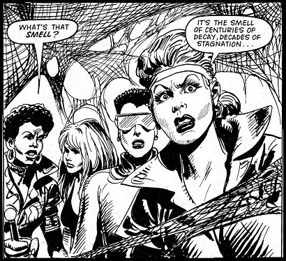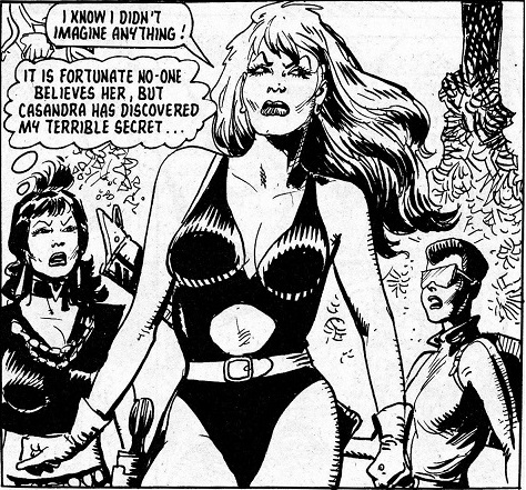 Though the story didn't run long enough, or even attempted to fully develop character profiles and relationships (something modern publications of this kind seldom do) those paying closer attention to the storyline as opposed to how tight the ladies costumes were will have perhaps noticed (and this is a personal opinion) a few hints at future character & tale development. The other prominent character, Kitten aside, was Casandra Cardeti (seen hectoring our heroine, in the picture on the right). A bit of an air-head, though more than made up for by her plunging neck-line and acres of cleavage, she had discovered Kittens' secret. What is Kittens' secret, I hear you not cry? Well, apparently, if she didn't get a regular fix from some sort of magic space dust she would age hundreds of years. Said space dust was stored within her robot side-kick 'Crud' (who wrote this stuff!?). The story ended before any of these questions could be answered. Perhaps a script or unpublished artwork waits longingly for publication, in the archives of what was once Fleetway? I suspect not, just as sure as this serial will never again grace the printed page on the newsagents bottom shelf. |